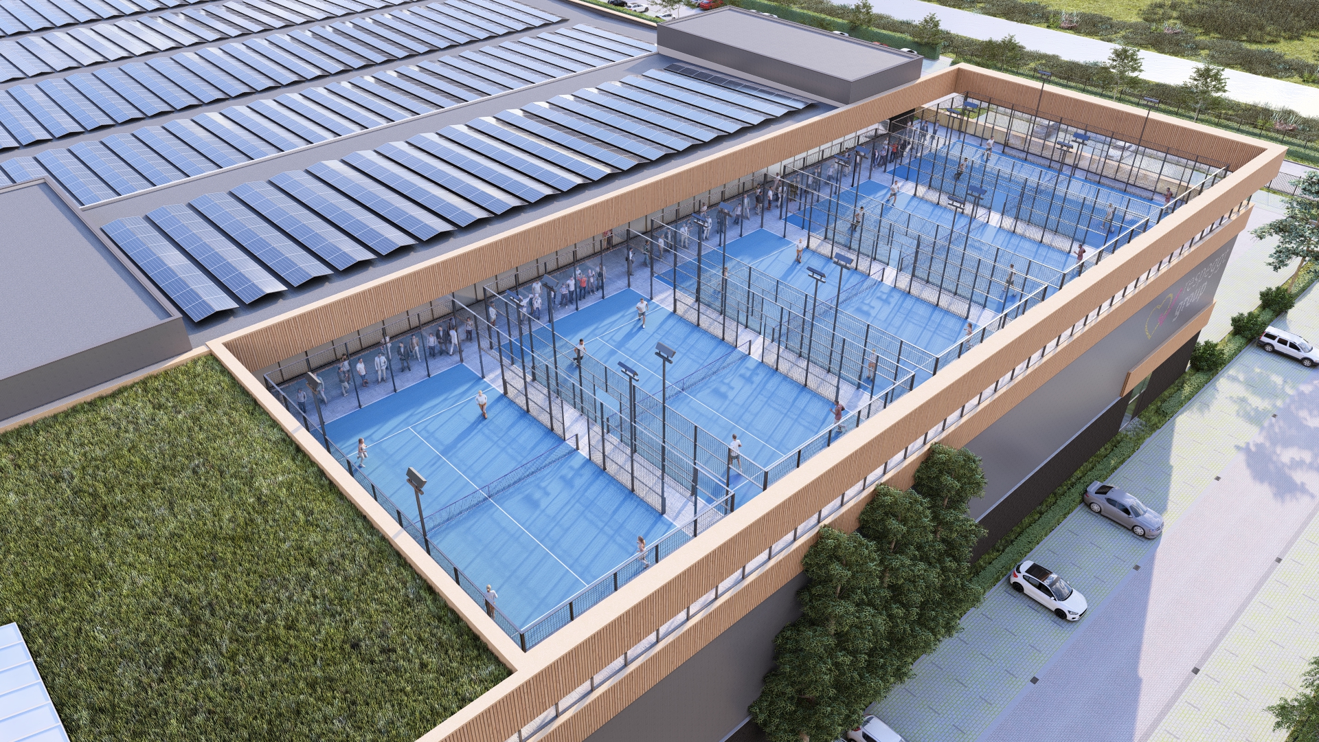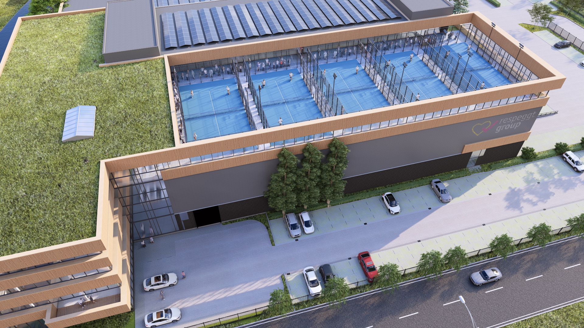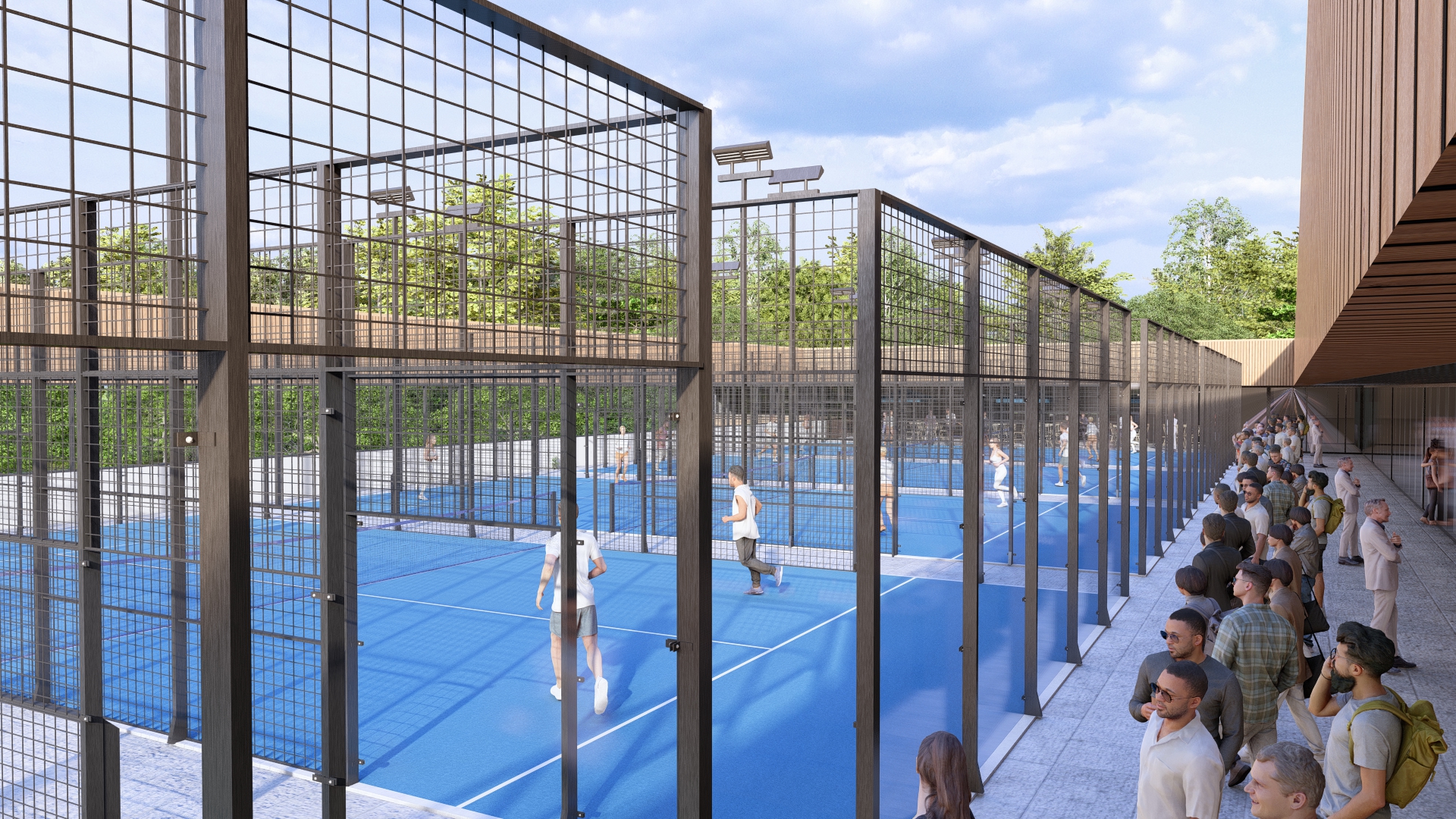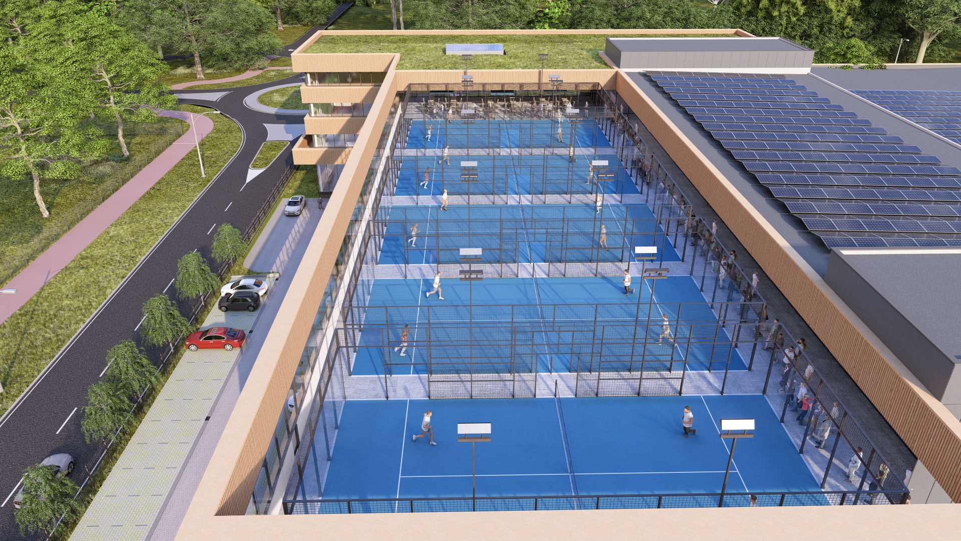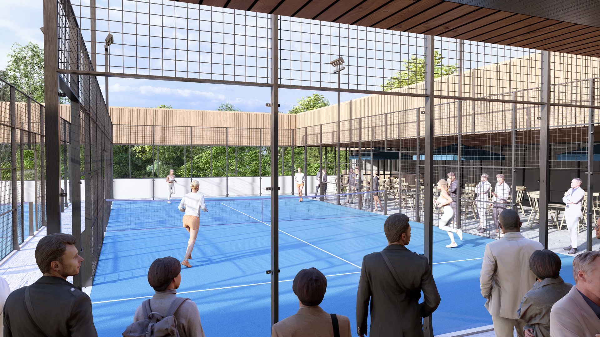 Padel een mix van tennis en squash dat hierbij als voorbeeld wordt gebruikt voor een eigentijdse en hippe functionele invulling op het dak samen met een fitnessruimte, een mogelijkheid voor een in house cross-fit box en verdere mogelijkheden voor ontspanningsoefeningen zoals yoga, samen met een gezonde maaltijd of drankje.