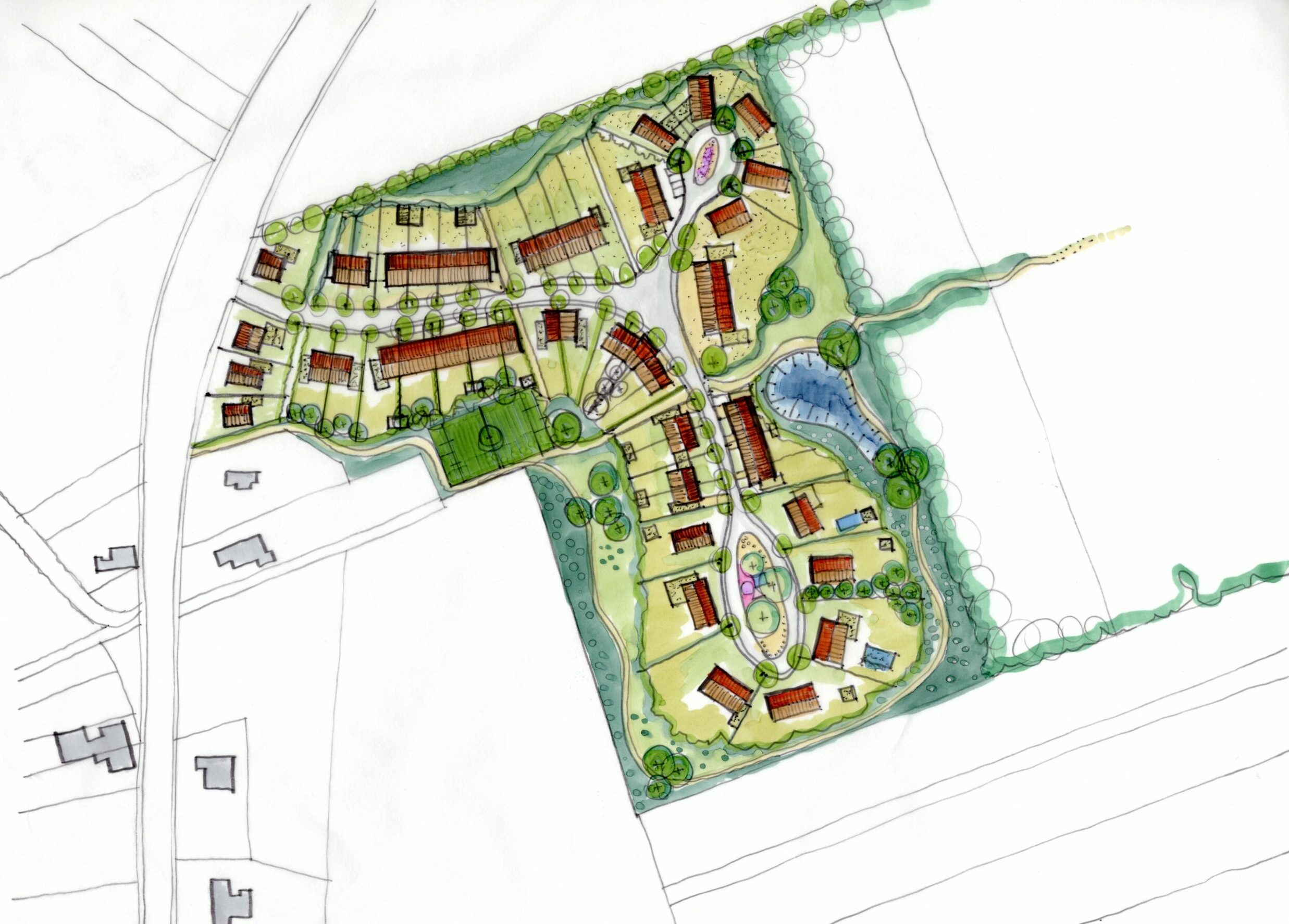 Met het schetsplan wordt aansluiting gezocht bij de bovenstaande randvoorwaarden en is er een eerste aanzet uitgewerkt volgens een kleinschalig ervenconcept ook